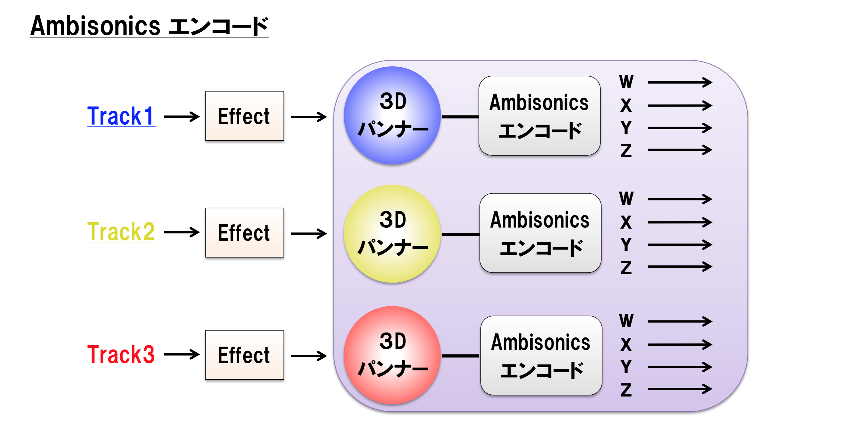 3Dパンナーで ”Ambisonicsエンコード” され『3D空間の情報』を持った『W,X,Y,Z』のデータのことを『1次Ambisonics』と言い、このベーシックの4トラックを特に『B-Format 』と呼んでいる。